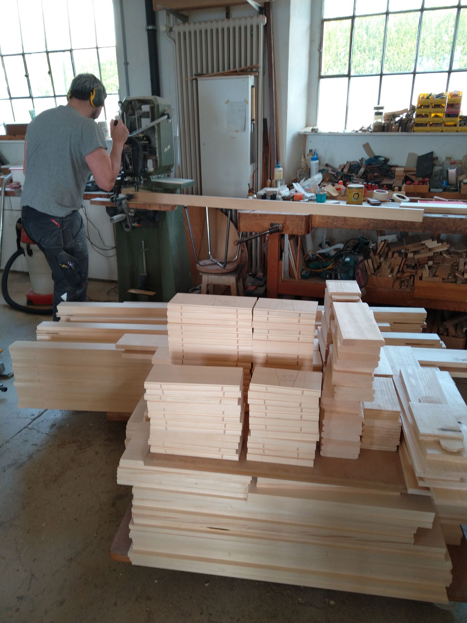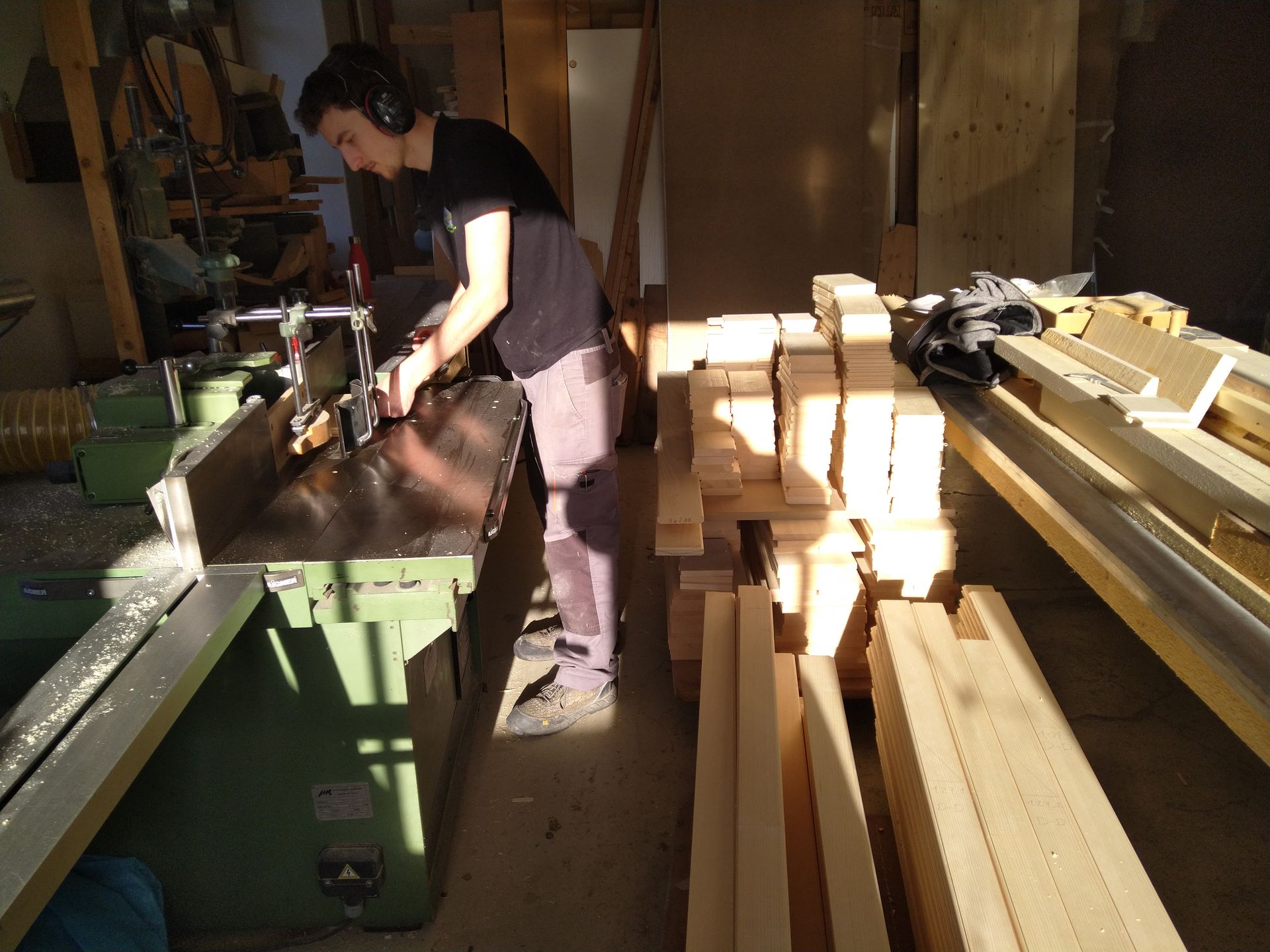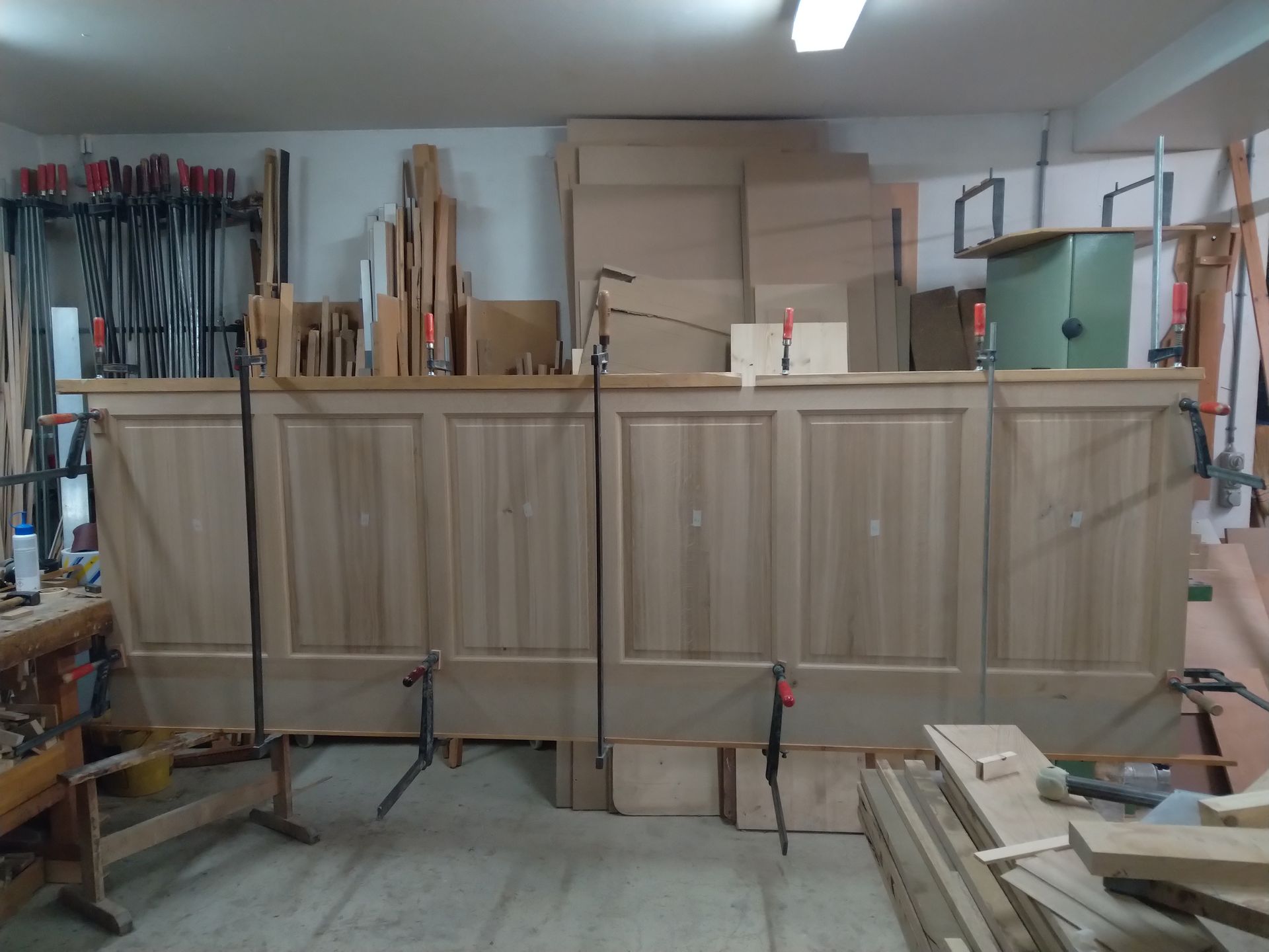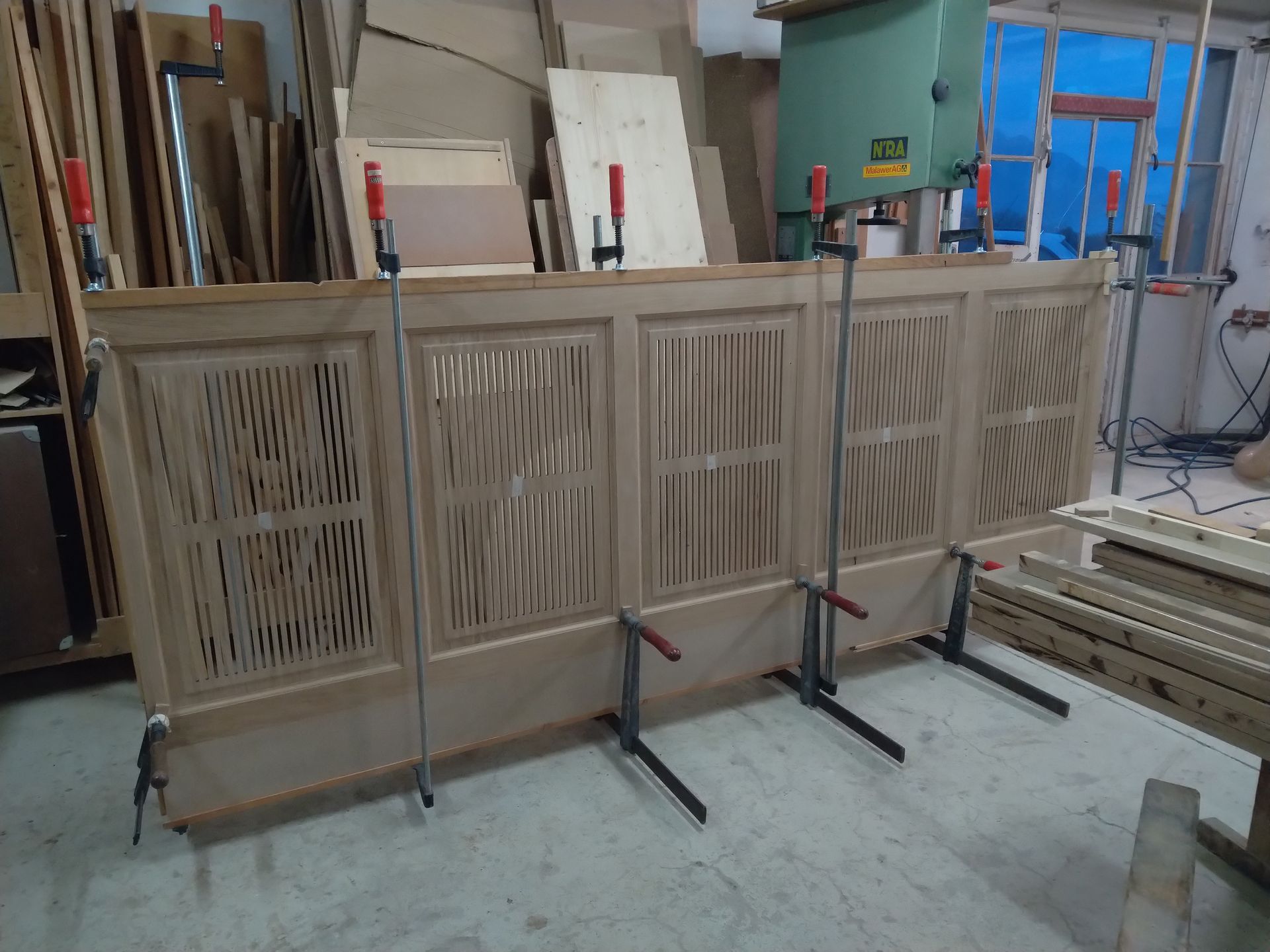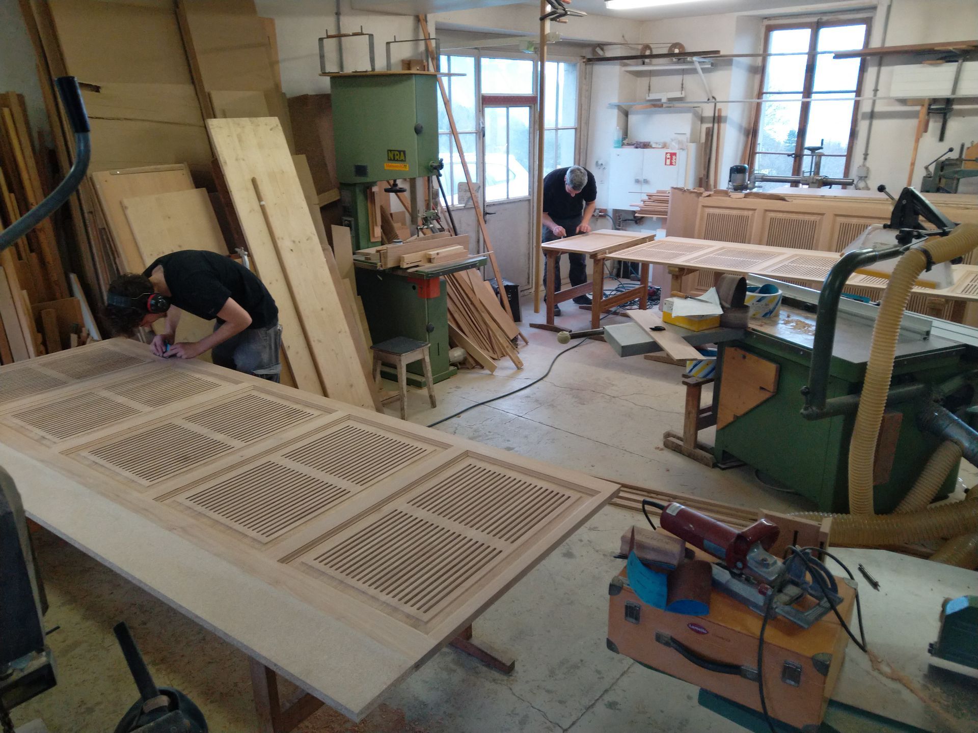 Fabrication des boiseries du réfectoire (le plafond a été réalisé par Art et Bois et Styliner)